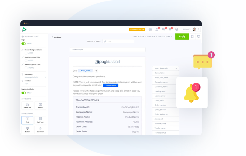 Customize and personalize your emails with our intuitive email editor, powered with branding options, dynamic short-codes and predefined blocks.